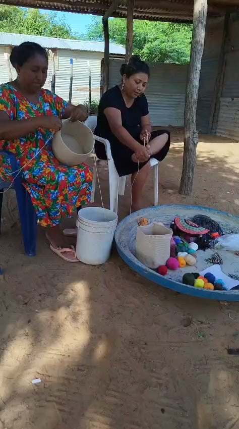 This Mochila is double cord so you pull the the tassels in side and closes it beautifully sinchet!